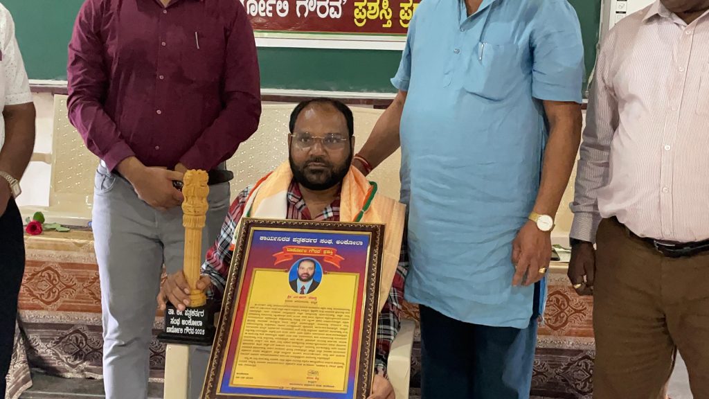 ಅಂಕೋಲಾ: ಕಾರ್ಯನಿರತ ಪತ್ರಕರ್ತರ ಸಂಘ ಅಂಕೋಲಾ ಕೊಡಮಾಡುವ ವಾರ್ಷಿಕ ಪ್ರಶಸ್ತಿ “ಬಾರ್ಡೋಲಿ ಗೌರವ ಪ್ರಶಸ್ತಿ-2025 ನ್ನು ಪತ್ರಿಕೋದ್ಯಮ, ಶಿಕ್ಷಣ ಹಾಗೂ ಸಮಾಜಸೇವೆಯಲ್ಲಿ ಮೂರು ದಶಕಗಳ ಸೇವೆ ಸಲ್ಲಿಸಿರುವ ಹಿರಿಯ ಪತ್ರಕರ್ತ ಎಂ.ಆರ್.ಮಾನ್ವಿಯವರಿಗೆ ಅಂಕೋಲಾದ ಗೋಕಲೆ ಸೆಂಟಿನರಿ ಕಾಲೇಜಿನಲ್ಲಿ ಸೋಮವಾರ ವಿಧಾನ ಪರಿಷತ್ ಸದಸ್ಯ ಗಣಪತಿ ಉಳ್ವೇಕರ್ ಪ್ರದಾನಿಸಿದರು.