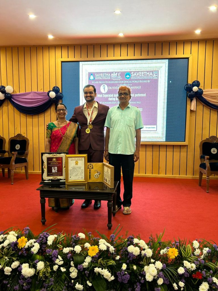 ಭಟ್ಟಳ :ಉತ್ತರ ಕನ್ನಡದ ಶಿರಾಲಿ ಪಟ್ಟಣದ ಉದ್ಯಮಿ ದೇವಿದಾಸ ಮಹಾಲೆ ಮತ್ತು ಶಿಕ್ಷಕಿ ನಾರಾಯಣಿ ಮಹಾಲೆ ಅವರ ಮಗನಾದ ಯುವ ದಂತವೈದ್ಯರಾದ ಡಾ. ವಿವೇಕ್ ದೇವಿದಾಸ್ ಮಹಾಲೆ ಅವರು ಸ್ನಾತಕೋತ್ತರ ಪದವಿ ಅವಧಿಯಲ್ಲೇ ಎರಡು ಪ್ರತಿಷ್ಠಿತ ವಿಶ್ವ ದಾಖಲೆಗಳನ್ನು ಗಳಿಸಿ ರಾಜ್ಯದ ಹೆಮ್ಮೆ ಹೆಚ್ಚಿಸಿದ್ದಾರೆ. ಸವೀತಾ ಡೆಂಟಲ್ ಕಾಲೇಜ್, ಚೆನ್ನೈನಲ್ಲಿ ಎಂಡೋಡಾಂಟಿಕ್ಸ್ ಪಿಜಿ ತರಬೇತಿ ಪಡೆಯುತ್ತಿರುವ ಅವರು ಒಟ್ಟು 150 ಕ್ಕೂ ಹೆಚ್ಚು ‘ಸೆಪರೇಟೆಡ್ ಇನ್ಸ್ಟ್ರುಮೆಂಟ್ ರಿಟ್ರೀವಲ್’ ಪ್ರಕರಣಗಳನ್ನು ಯಶಸ್ವಿಯಾಗಿ ನಿರ್ವಹಿಸಿದ ವಿಶ್ವದ ಮೊದಲ ಪೋಸ್ಟ್ಗ್ರಾಜುಯೇಟ್ ಎಂಬ ಗೌರವಕ್ಕೆ Raaba Book of World Records ಮತ್ತು Golden Book of World Records ಮನ್ನಣೆ ಲಭಿಸಿದೆ. ಅತ್ಯಂತ ಸವಾಲಿನ ಹಾಗೂ ಪರಿಣತಿಯ ಅಗತ್ಯವಿರುವ ಈ ಚಿಕಿತ್ಸಾ ವಿಧಾನದಲ್ಲಿ ಪಿಜಿ ಅವಧಿಯಲ್ಲೇ ಇಷ್ಟು ದಾಖಲೆಮಟ್ಟದ ಪ್ರಕರಣಗಳನ್ನು ಕೈಗೊಳ್ಳುವ ಸಾಧನೆ ಅಪರೂಪದದ್ದು.