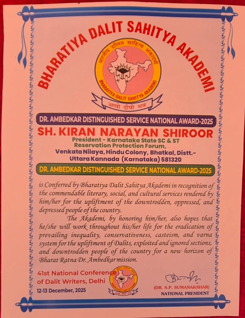 ಭಟ್ಕಳ : ದಲಿತ ಸಮುದಾಯದ ಹಕ್ಕುಗಳಿಗಾಗಿ ನಿರಂತರವಾಗಿ ರಾಜ್ಯಮಟ್ಟದಲ್ಲಿ ಹೋರಾಟ ನಡೆಸುತ್ತಿರುವ ರಾಜ್ಯ ಪರಿಶಿಷ್ಟ ಜಾತಿ ಮೀಸಲಾತಿ ರಕ್ಷಣಾ ಒಕ್ಕೂಟದ ಅಧ್ಯಕ್ಷರಾಗಿರುವ ಶ್ರೀ ಕಿರಣ್ ಶಿರೂರು ಅವರಿಗೆ 2025 ನೇ ಸಾಲಿನ ಪ್ರತಿಷ್ಠಿತ ಡಾ. ಬಿ ಆರ್ ಅಂಬೇಡ್ಕರ್ ರಾಷ್ಟ್ರೀಯ ವಿಶಿಷ್ಟ ಸೇವಾ ಪ್ರಶಸ್ತಿ ಪ್ರದಾನ ಮಾಡಲಾಗಿದೆ.