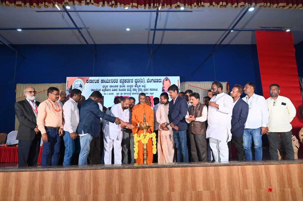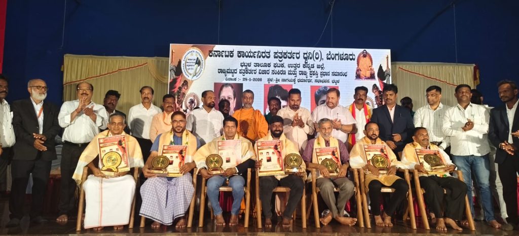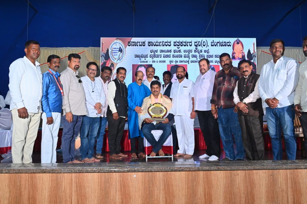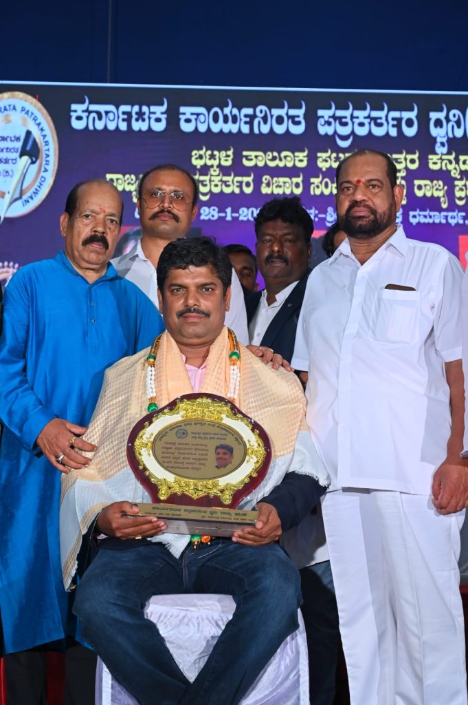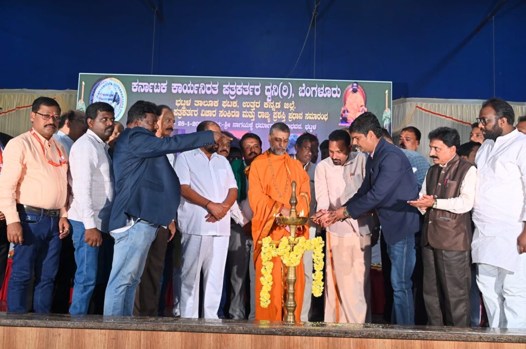 ಭಟ್ಕಳ : ಕರ್ನಾಟಕ ಕಾರ್ಯನಿರತ ಪತ್ರಕರ್ತರ ದ್ವನಿ ಸಂಘಟನೆಯ ಭಟ್ಕಳ ಘಟಕವು ರಾಜ್ಯಾಧ್ಯಕ್ಷ ಮಲ್ಲಿಕಾರ್ಜುನ್ ಬಂಗ್ಲೆ ನೇತೃತ್ವದಲ್ಲಿ ತಾಲೂಕಾಧ್ಯಕ್ಷ ಶಂಕರ್ ನಾಯಕ್ ಅಧ್ಯಕ್ಷತೆಯಲ್ಲಿ ನಡೆದ ರಾಜ್ಯಮಟ್ಟದ ಪತ್ರಕರ್ತರ ವಿಚಾರ ಸಂಕಿರಣ ಹಾಗೂ ರಾಜ್ಯ ಪ್ರಶಸ್ತಿ ಪ್ರಧಾನ ಸಮಾರಂಭವನ್ನು ಬಂಗಾರ ಮಕ್ಕಿ ಸಂಸ್ಥಾನದ ಶ್ರೀ ಮಾರುತಿ ಗುರೂಜಿ ಅವರು ಉದ್ಘಾಟಿಸಿ ಮಾತನಾಡುತ್ತಾ ಪತ್ರಕರ್ತರು ಯಾರದ್ದೋ ಒತ್ತಡಕ್ಕೆ ಮಣಿಯದೆ ಸಮಾಜದ ಹಿತದೃಷ್ಟಿಯಿಂದ ಪತ್ರಿಕಾ ಧರ್ಮವನ್ನು ಪಾಲಿಸಬೇಕು ಸಮಾಜ ಅಂಕುಡೊಂಕುವನ್ನು ತಿದ್ದುವ ಕೆಲಸ ಪತ್ರಕರ್ತರು ಮಾಡಬೇಕು ಎಂದು ಹೇಳಿದರು.